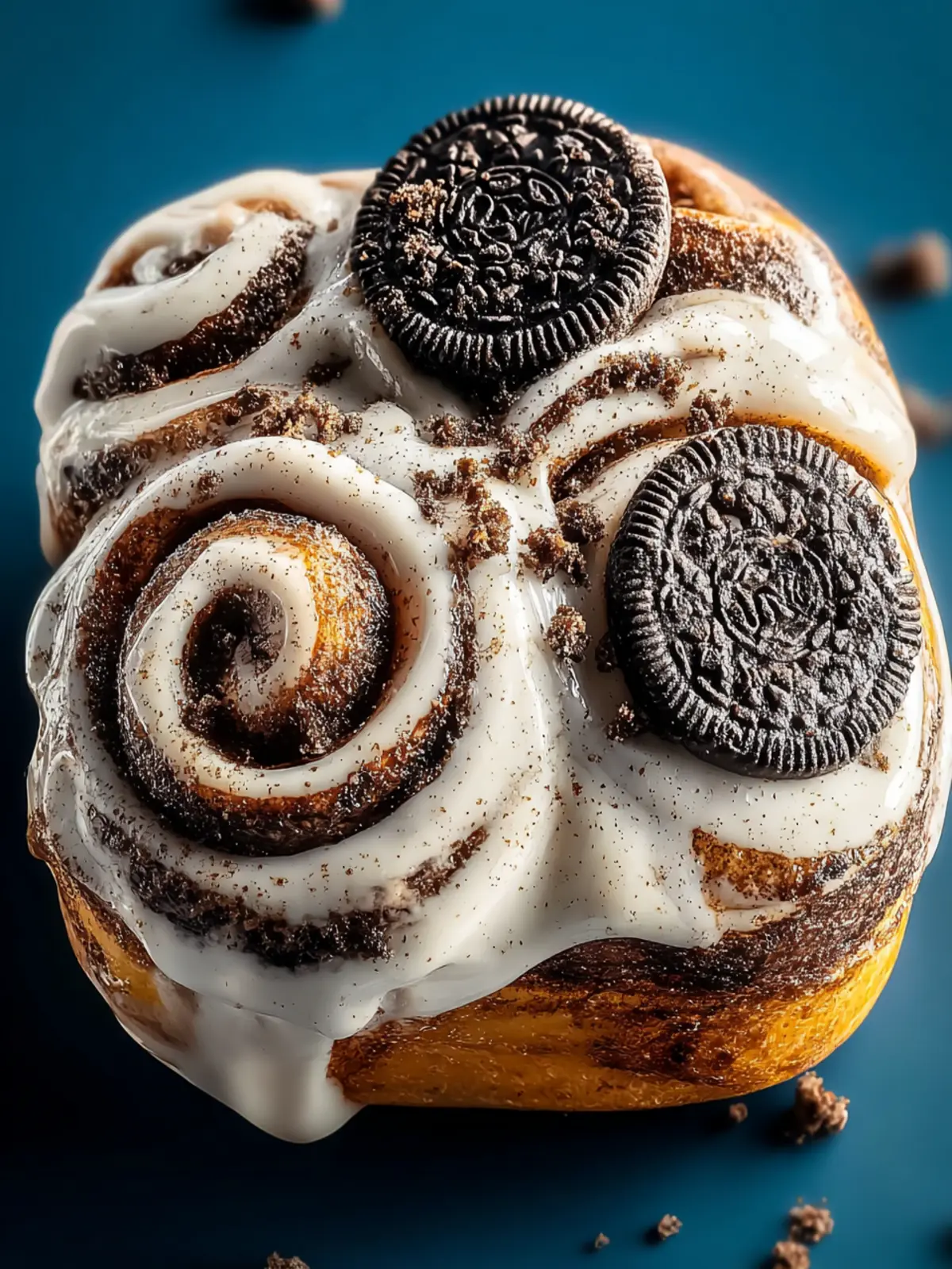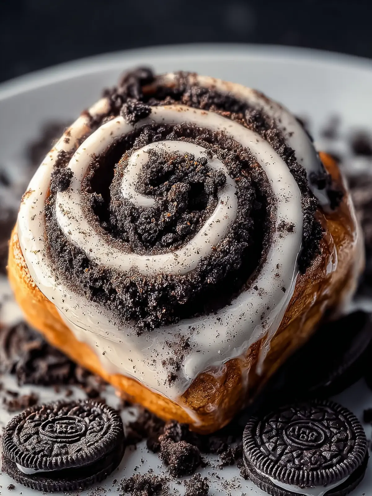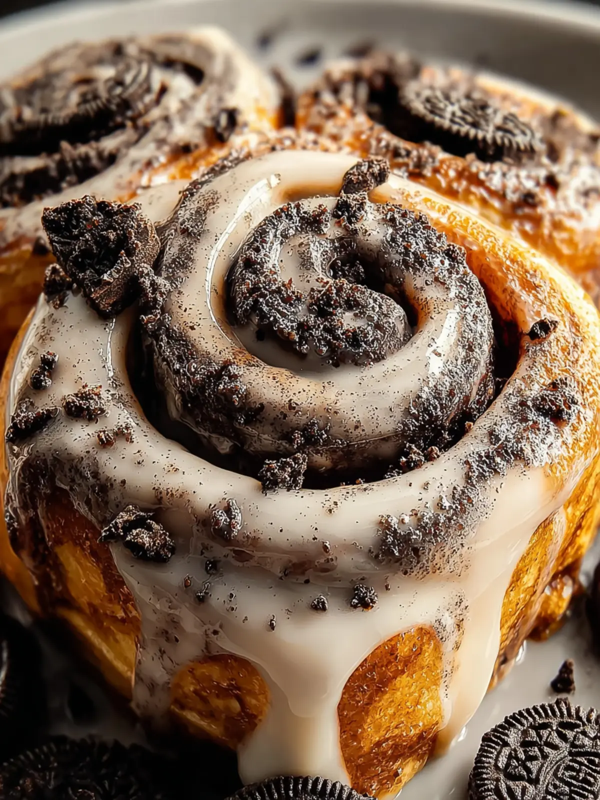 Delicious Oreo cinnamon rolls topped with creamy frosting.